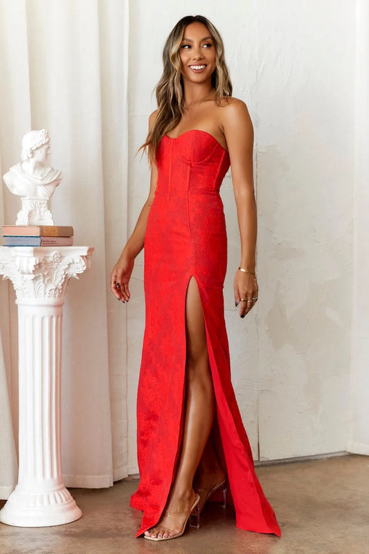 Women's Strapless Cocktail Maxi Prom Dress - Corset Bodice - Sweetheart Neckline - High Slit