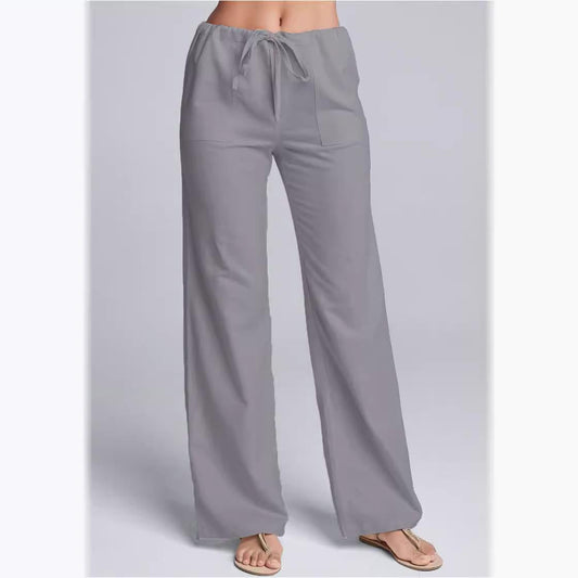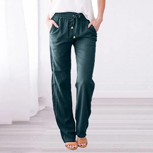 Caleni | Women’s Casual Trousers – Cotton Linen Blend – Loose Fit – Drawstring Waist – Full Length