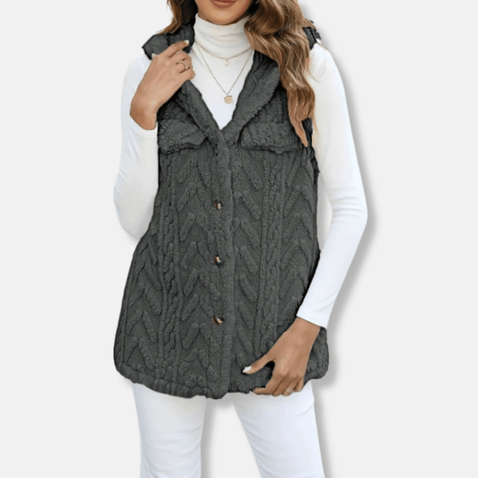 Women Hooded Vest Fuzzy Knit With Button Front And Chest Pockets